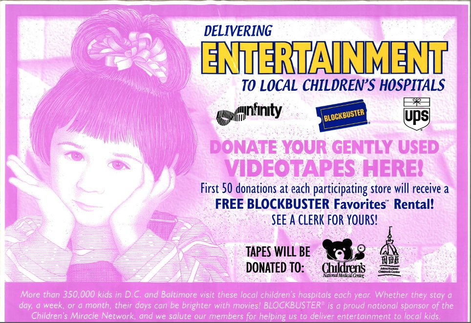 Tape drive for local children's hospital collected 2,500+ movies. In collaboration with local business partners we secured (UPS for delivery; local radio for promotion), the media coverage was incredible! And